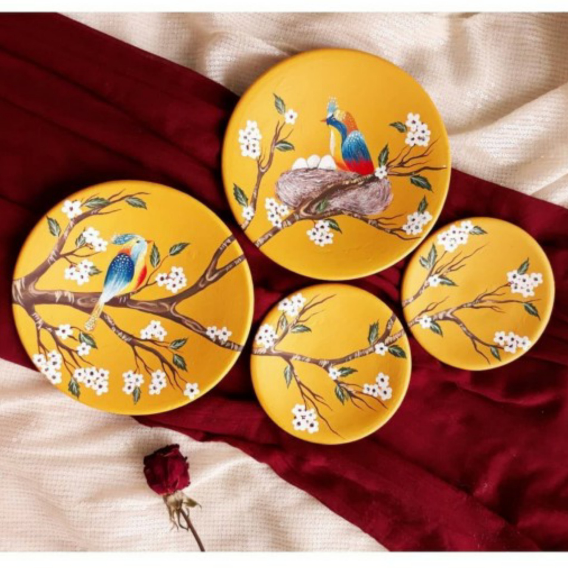 بشقاب دیوارکوب سفالی مجموعه 4 عددی طرح آشیانه و بلبل قطر 20-20-15-15