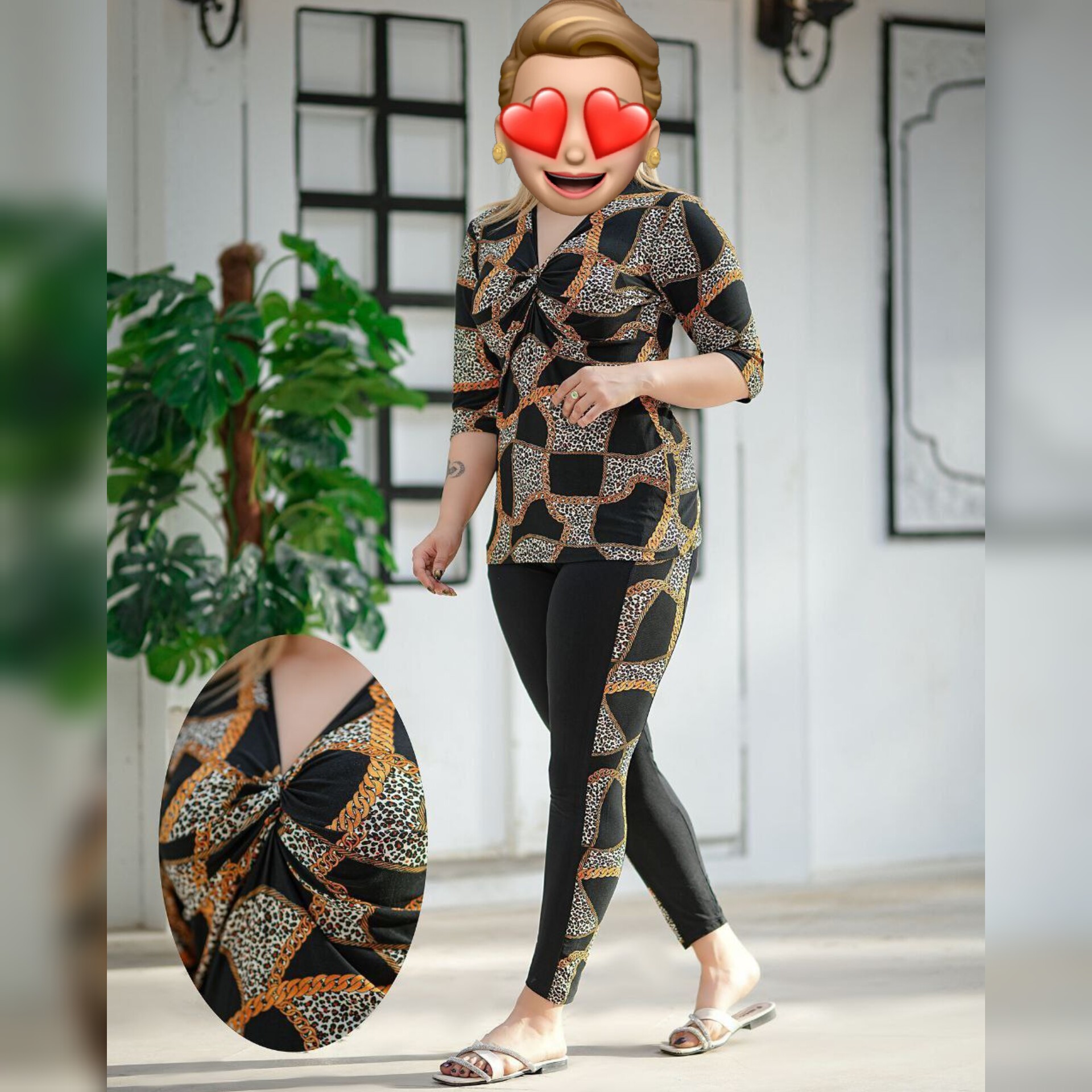 بلوز شلوار زنانه کیمونو طرح پلنگی و پیچازی دورس تو کرکی فری سایز